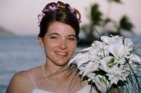 I kept it simple - no time for anything like Stickles to dry! I hand cut an "island," adhered the layers of the palm tree, and stamped "Happy Anniversary" using My Pink Stamper's "Happiest Moments" set. I also used some foam adhesive to pop up the tree. Simple, but I like it!